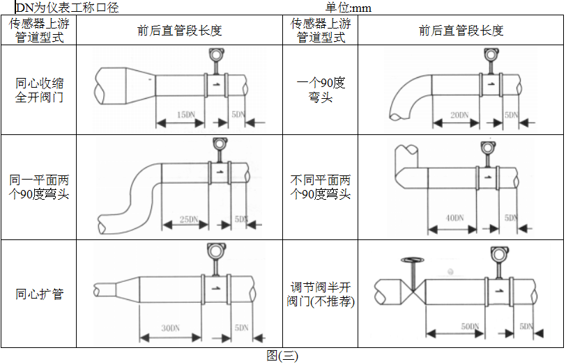 1. 渦街流量?jī)x表對(duì)安裝點(diǎn)的上下游直管段有一定要求,否則會(huì)影響介質(zhì)在管道中的流場(chǎng),影響儀表的測(cè)量精度。儀表的上下游直管段長(zhǎng)度要求見圖(三)